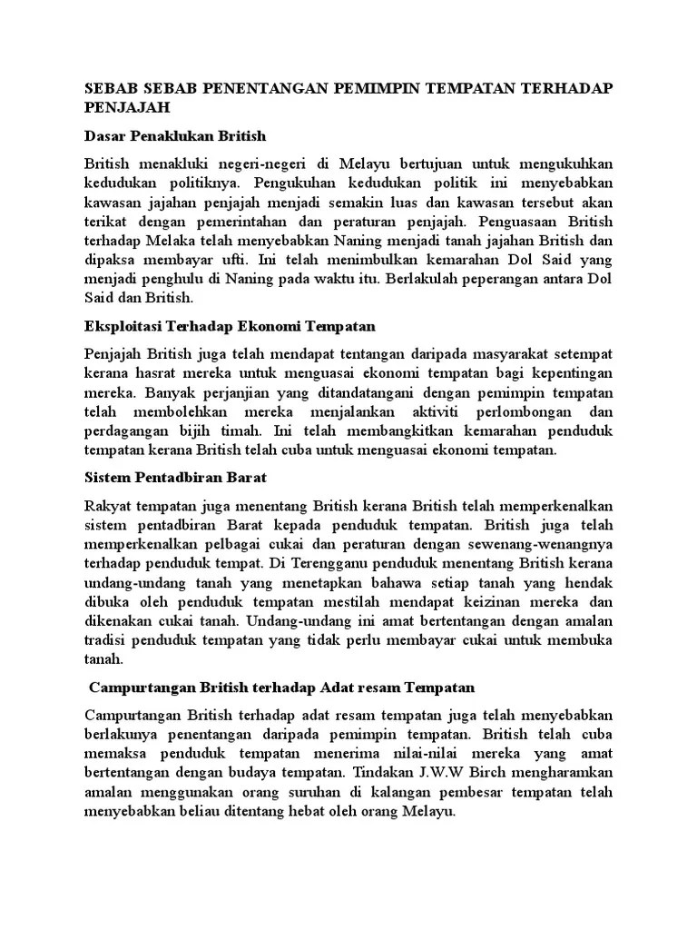 Penentangan dan 2.1.2 peristiwa penentangan pemimpin tempatan. Daripada suku semelenggang, dol said mewarisi penghulu anjak sebagai penghulu naning pada tahun 1799 ketika. Ramai pejuang tanah air muncul seperti sultan ahmad tajuddin, dol said, rentap, sharif masahor,. Share 7.4 7.4 kesan penentangan masyarakat tempatan everywhere for free. 7.3 penentangan masyarakat tempatan terhadap kuasa barat 7.4 kesan penentangan masyarakat tempatan. Pelaksanaan pentadbiran british terhadap masyarakat tempatan. Dol said, yamtuan antah, rentap, shahrif masahor dan dato' bahaman. Kesan terhadap kuasa pemerintah dan kehidupan masyarakat tempatan .
